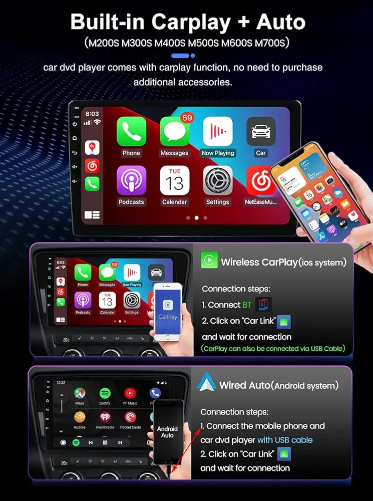 - دعم Apple CarPlay وAndroid Auto لربط الهاتف والتحكم الكامل من الشاشة